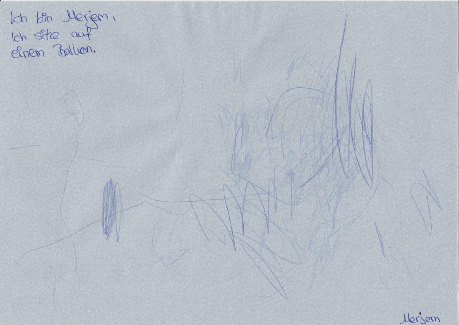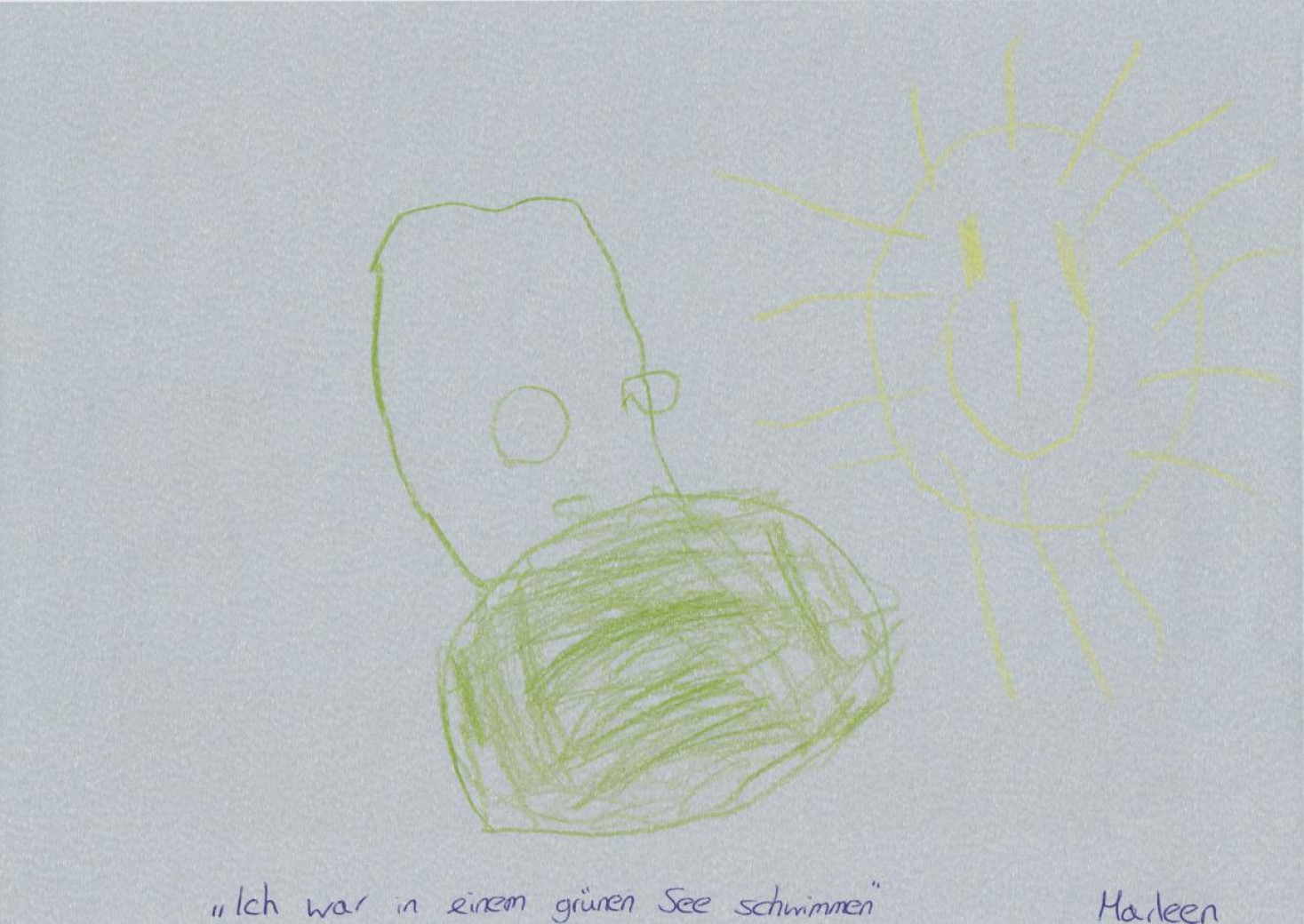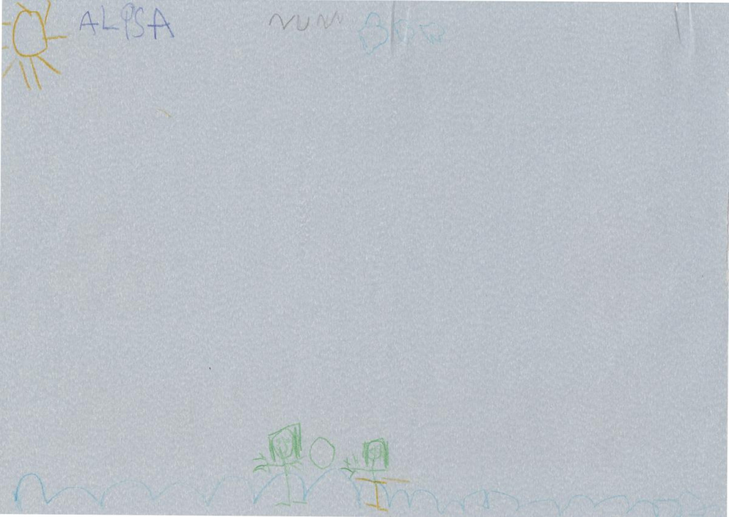 Alisa | "I drew a picture of a beach. I'm playing ball in the sea with my sister and the sun is shining." |