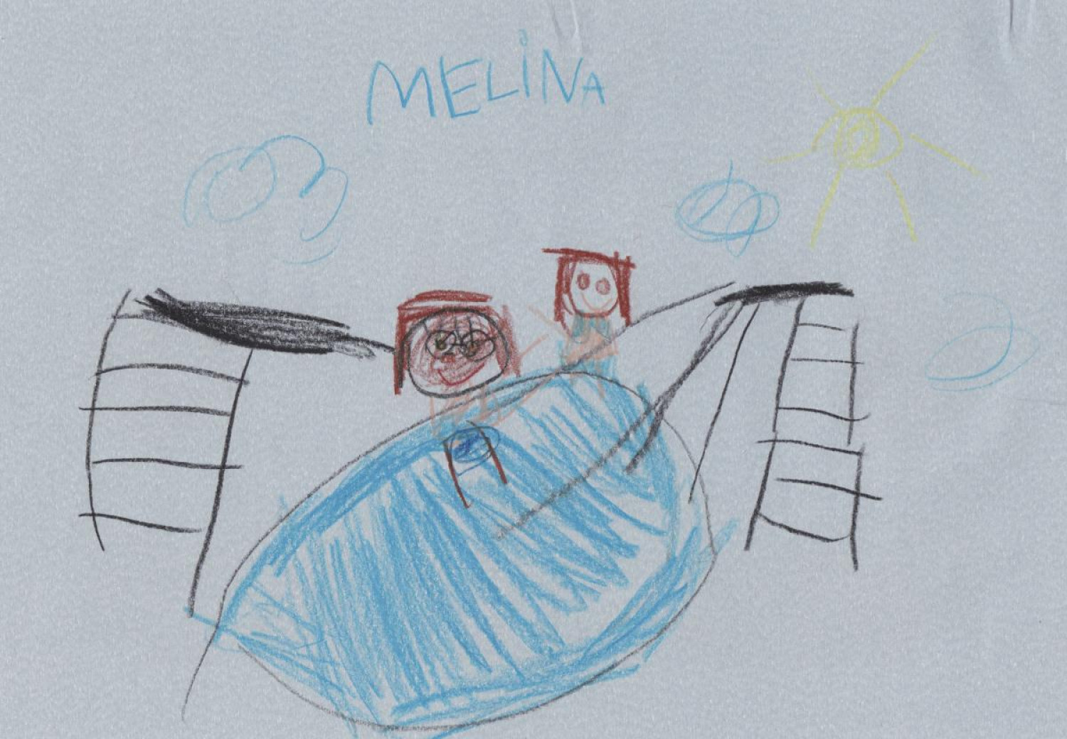Melina | "On vacation, I went to the water park with my dad. We went down a giant slide. I was in the deep pool. Dad held me tight and we slid down a lot. I was wearing my blue bikini and the sun was shining." |