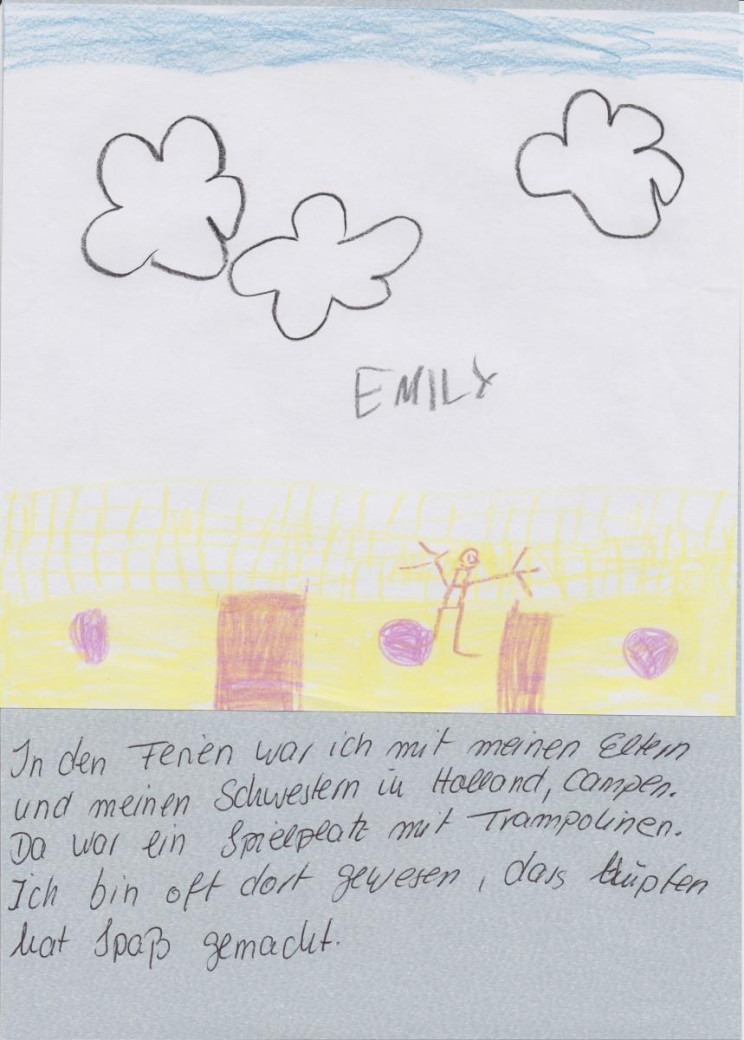 Emily | "During the vacations, I went camping in Holland with my parents and my sisters. There was a playground with trampolines. I went there a lot, the jumping was fun." |