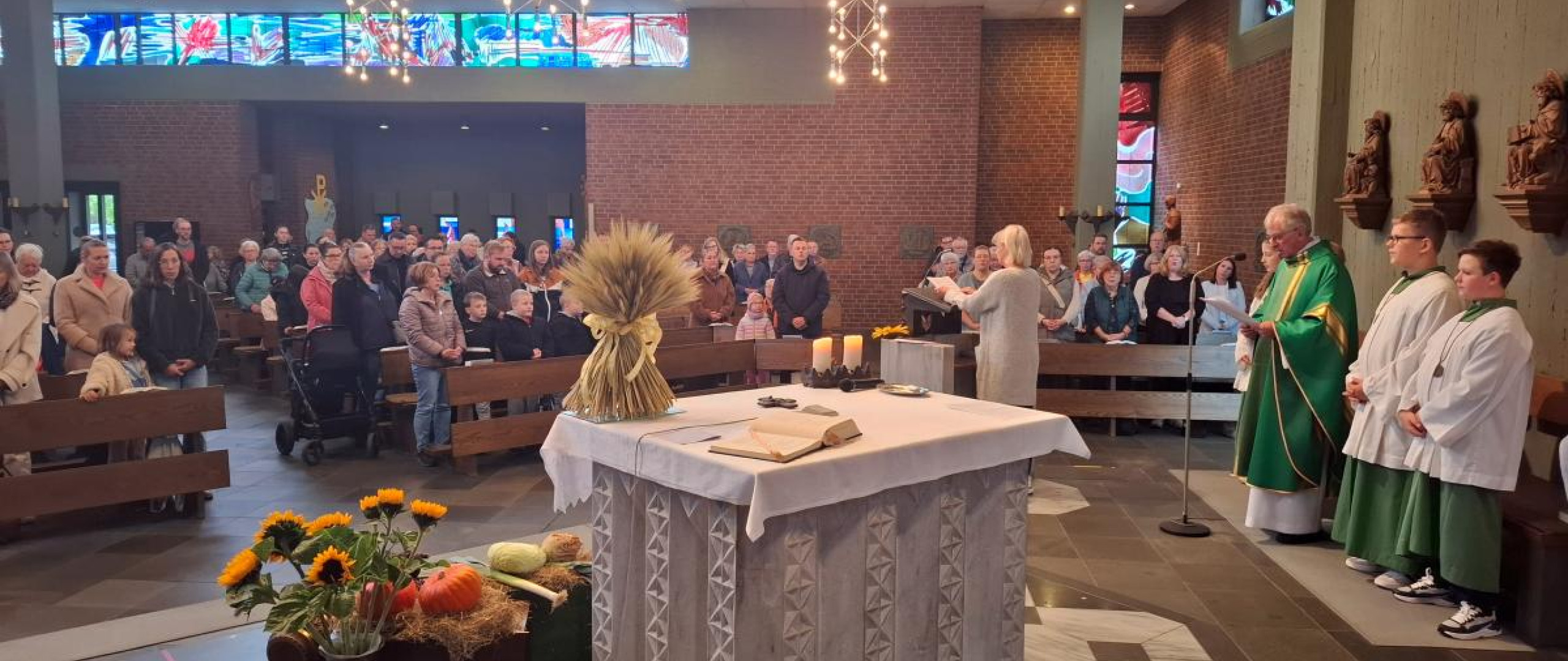 Auch in diesem Jahr fand in Mariä Heimsuchung Bodelschwingh wieder ein großes Erntedankfest statt. Pastor Karl Kudla freute sich über eine bestens gefüllte Kirche, in der mit einem Erntealtar auch der Dank für die Gaben der Schöpfung gut sichtbar war. Im Predigtgespräch mit den Kindern und Erwachsenen ging Gemeindereferent Markus Kohlenberg auf die Dankbarkeit für die Ernte und viele andere Lebensgaben ein.