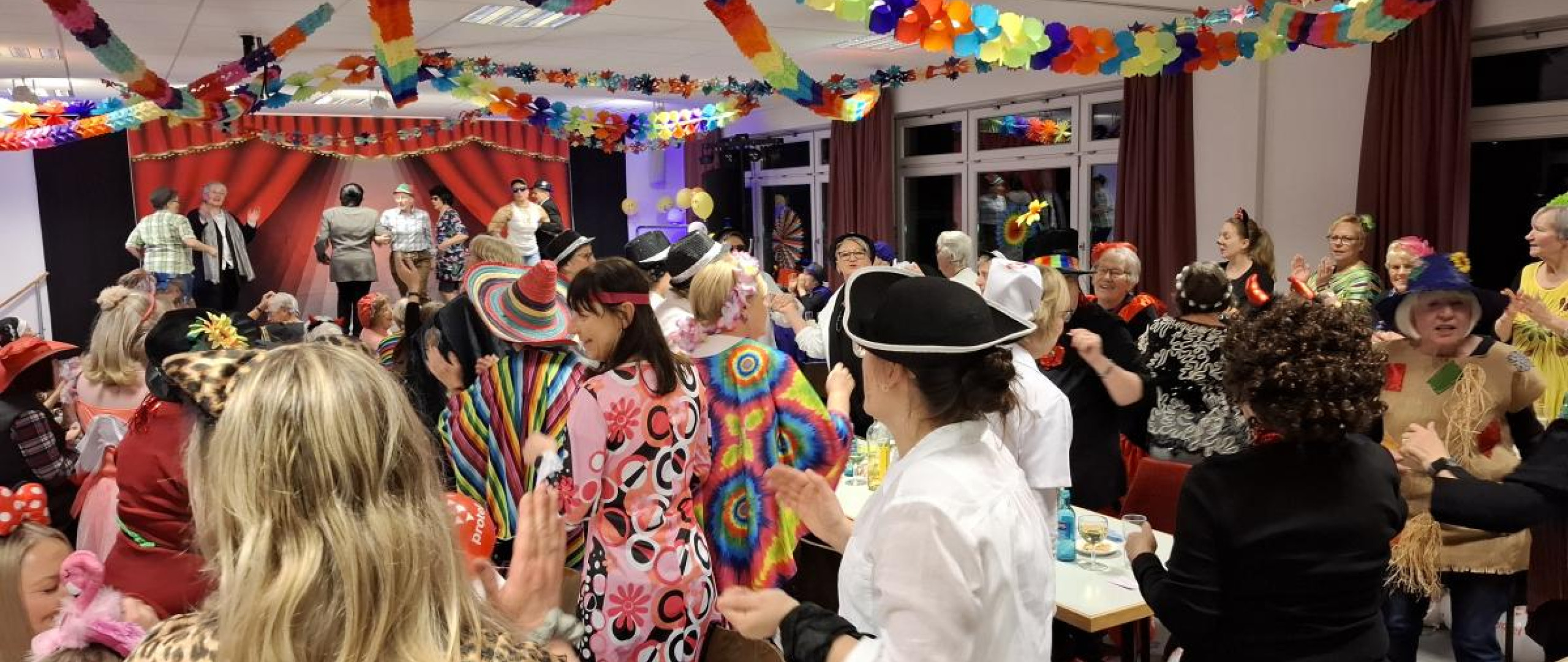 Gestärkt mit Kaffee und Kuchen startete das Programm mit dem Einmarsch der Theatergruppe, die als karnevalistischer "Bibelkreis" mit den rund 120 Frauen im Saal gleich "Die Hände zum Himmel" erhoben. Dann konnte Moderatorin Steffi die erste Büttenrede des Nachmittags ansagen, in der "vom Weg zum Ball der einsamen Herzen" berichtet wurde. Ein Sketch führte dann ganz kriminalistisch in die Arbeit der Polizei ein, da ein Mann nach einer Mallorca-Reise vermisst wurde. Nach der ausführlichen Täterbeschreibung wollte die Ehefrau ihren Gatterich allerdings dann doch nicht zurück haben. Anschließend heizte Pfarrer Hubert Werning mit einem Medley bekannter Schlager- und Ballermannhits dem Saal ein, bevor lustige Szenen aus der Eheberatung zum Besten gegeben wurden. Den Joe Cocker Hit "You can leave your hat on" verlegte die Theatergruppe dann in einen Waschsalon und sorgte mit bester Pantomime für viele Lachtränen im Publikum. Mit einer Tanzdarbietung ging es dann in die Pause.