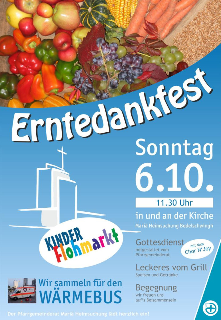 Am Sonntag, 6. Oktober lädt der Pfarrgemeinderat Mariä Heimsuchung zum Erntedankfest in der katholischen Gemeinde Bodelschwingh ein. Der Familiengottesdienst um 11.30 Uhr wird u.a. vom Chor N'Joy mitgestaltet. Anschließend ist die Möglichkeit zur Begegnung bei einem kleinen Erntedankfest auf dem Kirchplatz mit Grillwürstchen, Leberkäs, Federweißem mit Zwiebelkuchen und (Obst)Kuchen. Im Gemeindezentrum findet parallel dazu ein Kinder-Flohmarkt statt - hier sind leider bereits alle Tische zum Trödeln vergeben.