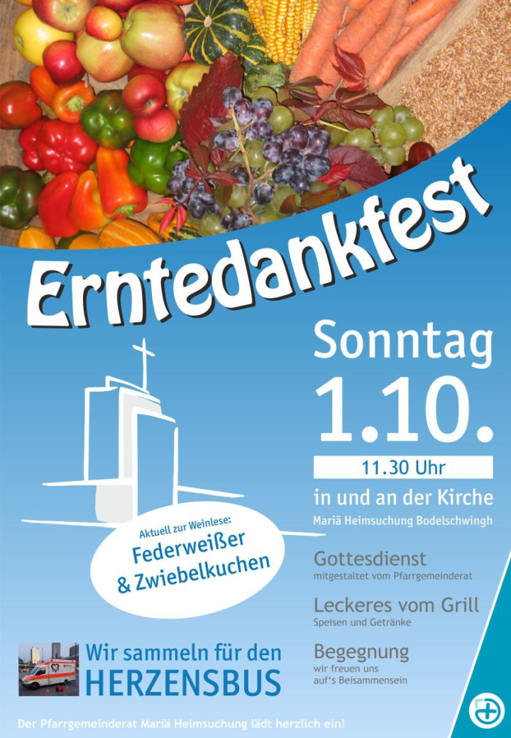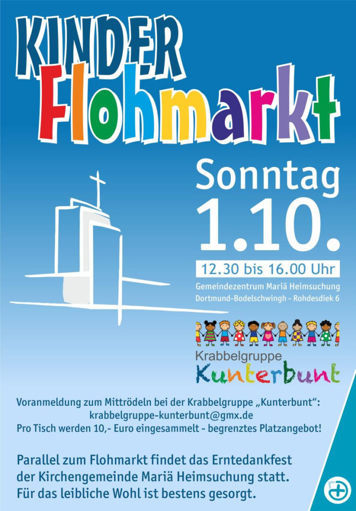 Der Pfarrgemeinderat Mariä Heimsuchung Bodelschwingh gestaltet den Gottesdienst um 11.30 Uhr zum Erntedankfest mit. Anschließend lädt ein kleines Erntedankfest mit Leckereien vom Grill, sowie Federweißen & Zwiebelkuchen auf den Kirchplatz bzw. ins Gemeindezentrum ein. Parallel dazu lädt die Krabbelgruppe Kunterbunt ab 12.30 Uhr zum Kinderflohmarkt ins Gemeindezentrum ein. Wer mittrödeln möchte, meldet sich bitte per Mail krabbelgruppe-kunterbunt@gmx.de an. Pro Tisch werden 10,00 Euro eingesammelt. Es gibt ein begrenztes Platzangebot.