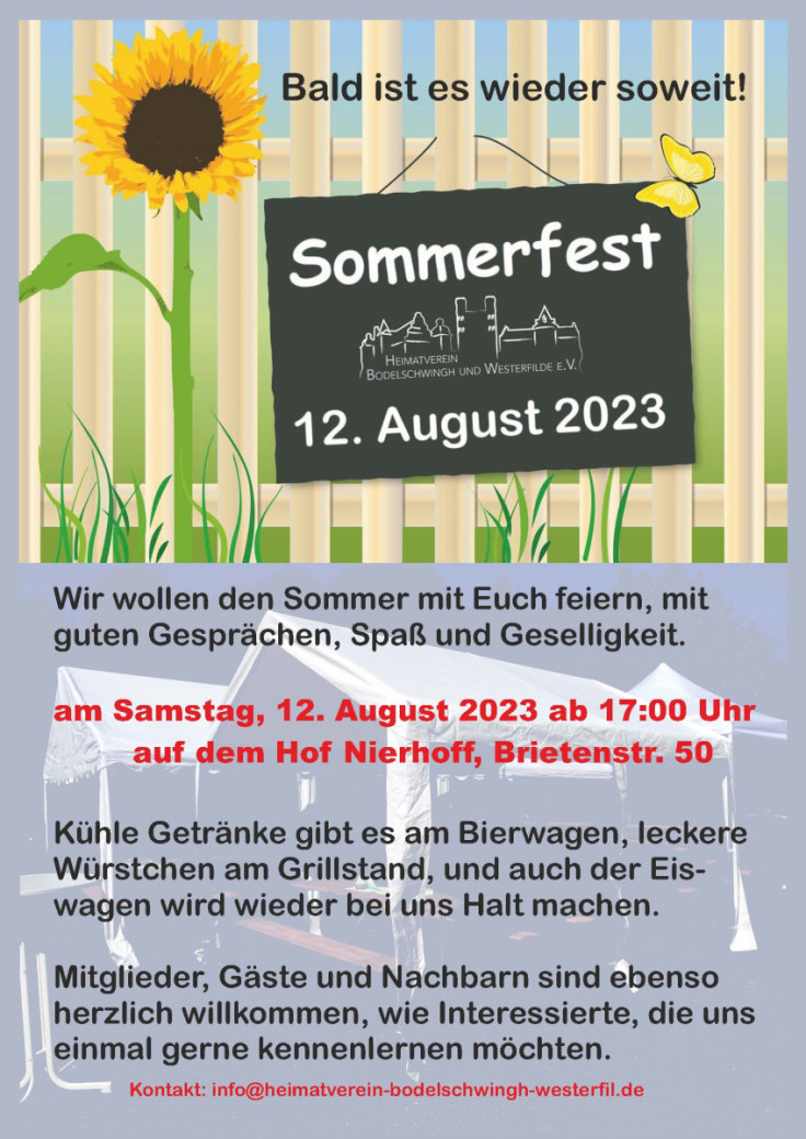 Der Heimatverein Westerfilde und Bodelschwingh lädt zum Sommerfest mit guten Gesprächen, Spaß und Geselligkeit ein. Neben kühlen Getränken gibt es Grillwürstchen und Eis. Mitglieder, Gäste und Nachbarn sind ebenso herzlich willkommen, wie Interessierte, die uns einmal kennenlernen möchten.
