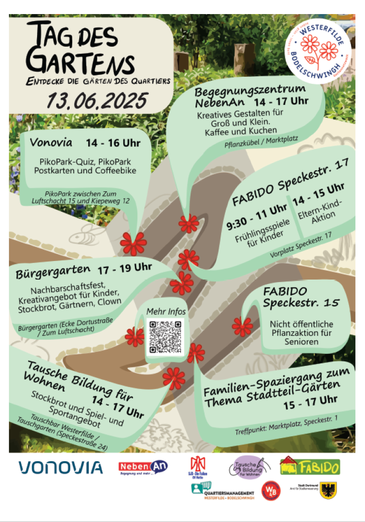 Am Freitag, den 13. Juni 2025, lädt das Gartennetzwerk Westerfilde und Bodelschwingh zum gemeinsamen Feiern, Pflanzen und Entdecken ein! Beim Tag des Gartens erwarten euch an vielen Orten im Stadtteil kreative Mitmachaktionen, Spiele für Kinder, Unterhaltung für Erwachsene, leckere Kleinigkeiten und die Gelegenheit, das Engagement der lokalen Gärten hautnah zu erleben. Kommt vorbei!